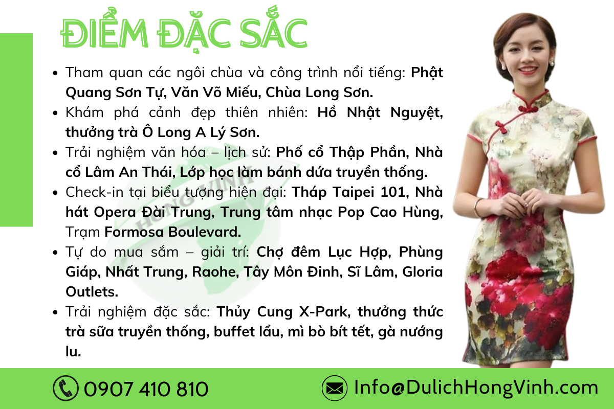 Hành trình 5N4Đ khám phá Đài Loan từ Cao Hùng – Đài Trung – Đài Bắc: trải nghiệm văn hóa, tâm linh, thiên nhiên và ẩm thực đặc sắc. Tham quan Phật Quang Sơn, hồ Nhật Nguyệt, Taipei 101, thả đèn trời Thập Phần, dạo chợ đêm, thưởng thức trà sữa và các món ăn trứ danh xứ Đài.