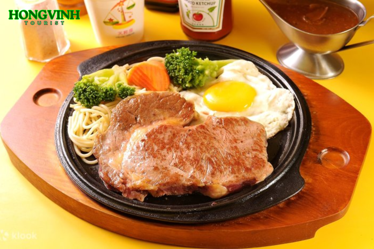 Xe và HDV Đài Loan đón đoàn dùng bữa Tối, thưởng thức món Beefsteak kiểu Đài Loan – món ăn giao hòa giữa ẩm thực phương Tây và hương vị bản địa. Miếng bò được nướng nóng trên đĩa gang, thơm lừng, ăn kèm mì Ý, trứng ốp la và nước sốt tiêu đen đặc trưng, mang đến trải nghiệm ẩm thực đậm đà, mới lạ và đầy năng lượng.