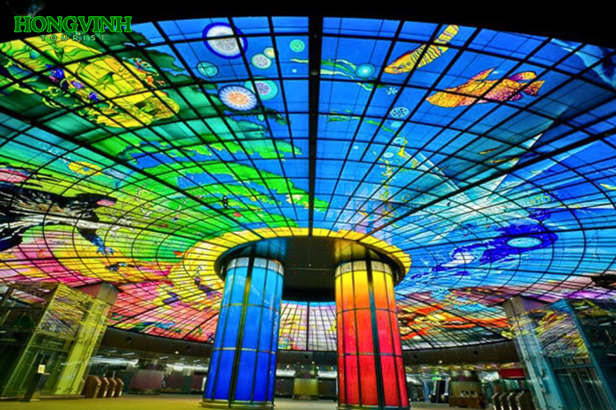 • Trạm tàu điện ngầm Formosa – nhà ga Formosa Boulevard còn khiến du khách phải trầm trồ khen ngợi. Bởi vẻ đẹp của mái vòm ánh sáng nằm ở khu vực trung tâm. Đây chính xác là tác phẩm nghệ thuật được vẽ hoàn toàn bằng tay của người nghệ sĩ gốc Ý – Narcissus. Với tổng diện tích lên đến 660m2; Đường kính khoảng 30m. Và hơn 4500 mảnh thủy tinh được cung cấp bởi xưởng thủ công Derix, Đức (Tặng 1 vé trải nghiệm 1 chiều).