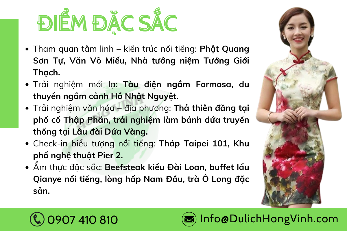 Hành trình 5N4Đ khám phá Đài Loan từ Đài Loan – Đài Trung – Cao Hùng: trải nghiệm văn hóa, tâm linh, thiên nhiên và ẩm thực đặc sắc. Tham quan Phật Quang Sơn, hồ Nhật Nguyệt, Taipei 101, thả đèn trời Thập Phần, dạo chợ đêm, thưởng thức trà Ô Long và các món ăn trứ danh xứ Đài Loan