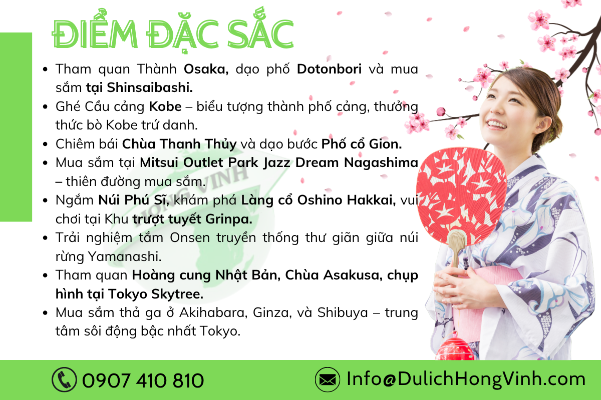 Vi vu xứ sở hoa anh đào – check-in cực chất từ Dotonbori rực rỡ đến Núi Phú Sĩ huyền thoại! Vui hết mình cùng hành trình 6N5Đ đậm chất Nhật: ẩm thực, mua sắm, văn hóa – tất cả trong một chuyến đi trọn vẹn.
