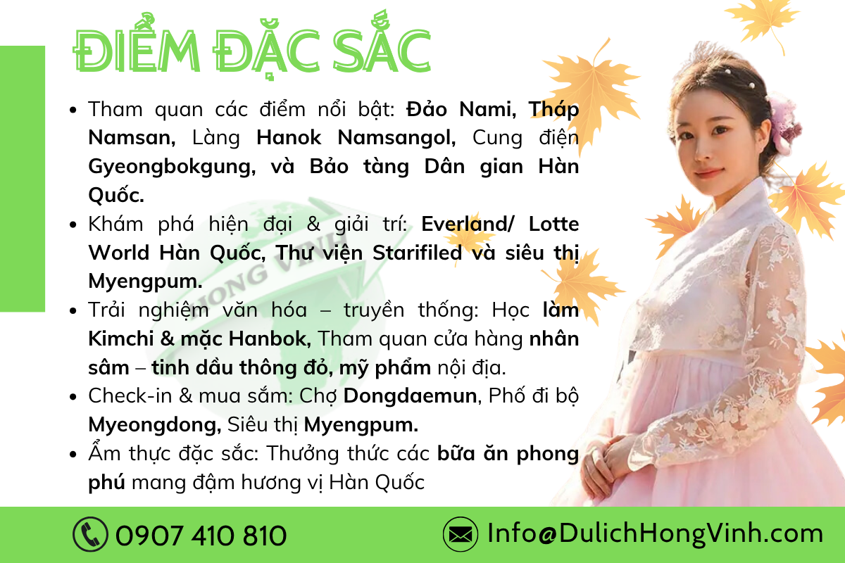 - Làng Namsangol Hanok – Ngôi làng “đặc biệt và duy nhất” gìn giữ nếp sống sinh hoạt, hội tụ nét văn hóa truyền thống từ thời Joseon. Làng Hanok Namsangol lưu giữ gần như nguyên vẹn những dấu ấn xa xưa của thời Joseon, Hàn Quốc. Tối:Dùng buổi tối tại nhà hàng địa phương. Tự do khám phá Seoul về đêm.