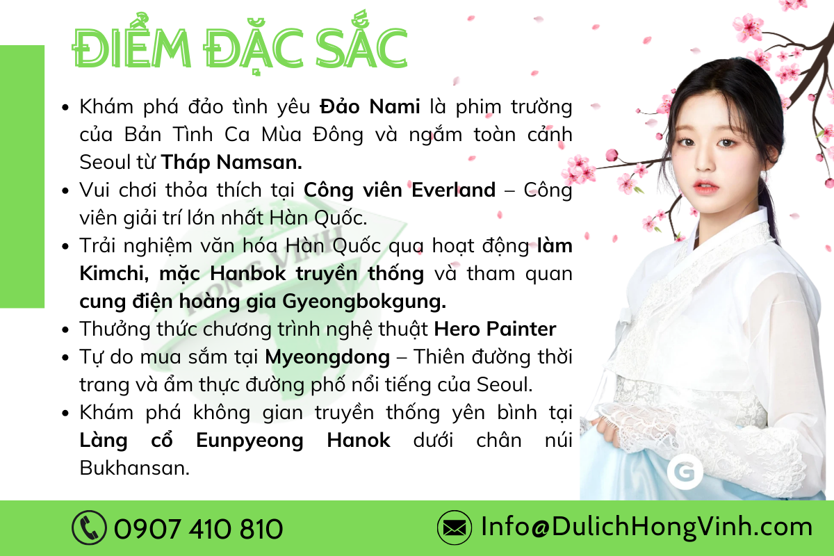 Hành trình khám phá Seoul sôi động với những điểm đến nổi tiếng như Đảo Nami lãng mạn, Tháp Namsan biểu tượng thủ đô và vui chơi thỏa thích tại Công viên Everland. Trải nghiệm văn hóa Hàn Quốc đặc sắc với Hanbok, Kimchi, tham quan Gyeongbokgung cổ kính và mua sắm thả ga tại Myeongdong – thiên đường thời trang và ẩm thực Seoul.