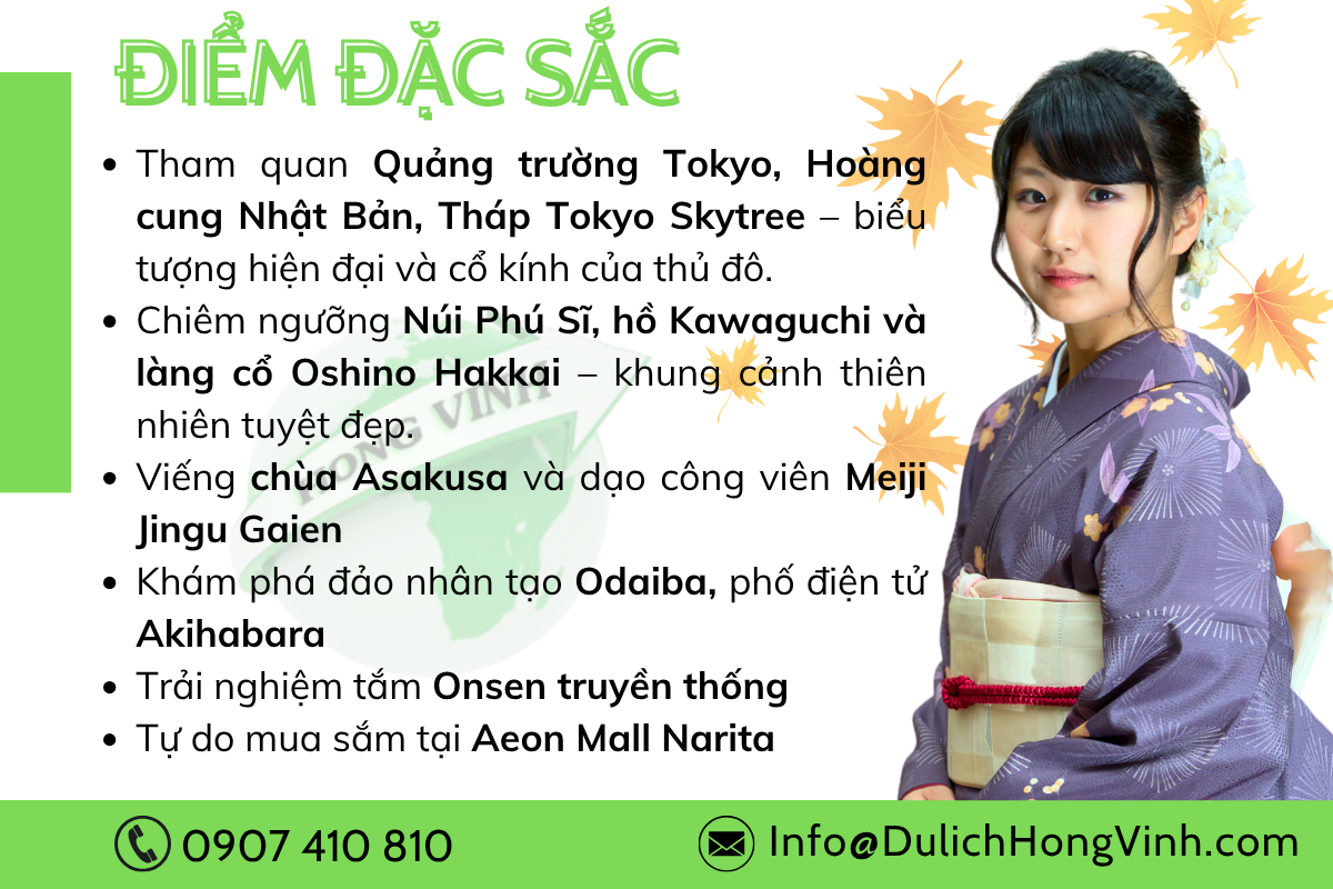 Tour Nhật Bản 5N4Đ – Tokyo – Yamanashi – Hakone – Narita: Hành trình khám phá Núi Phú Sĩ, hồ Kawaguchi, làng cổ Oshino Hakkai, tham quan chùa Asakusa, Odaiba, Akihabara, trải nghiệm tắm Onsen truyền thống và mua sắm tại Aeon Mall Narita – trọn vẹn sắc thu xứ Phù Tang.