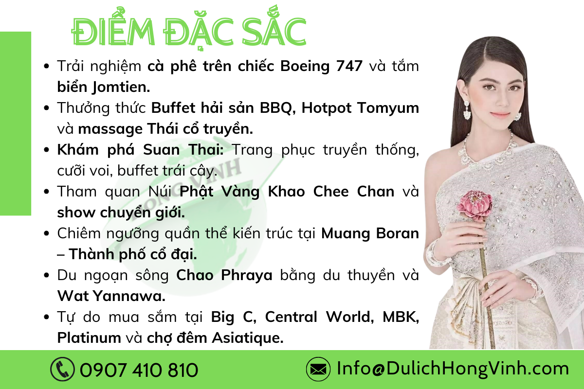 Hành trình 5N4Đ Thái Lan, khám phá Pattaya sôi động, trải nghiệm Suan Thai “All in one”, viếng Núi Phật Vàng, tham quan thành phố cổ Muang Boran, du ngoạn sông Chao Phraya và chiêm bái Wat Arun linh thiêng. Thưởng thức buffet du thuyền sang trọng, massage Thái cổ truyền, show nghệ thuật hoành tráng, mua sắm tại Bangkok sầm uất và tận hưởng những bãi biển tuyệt đẹp.