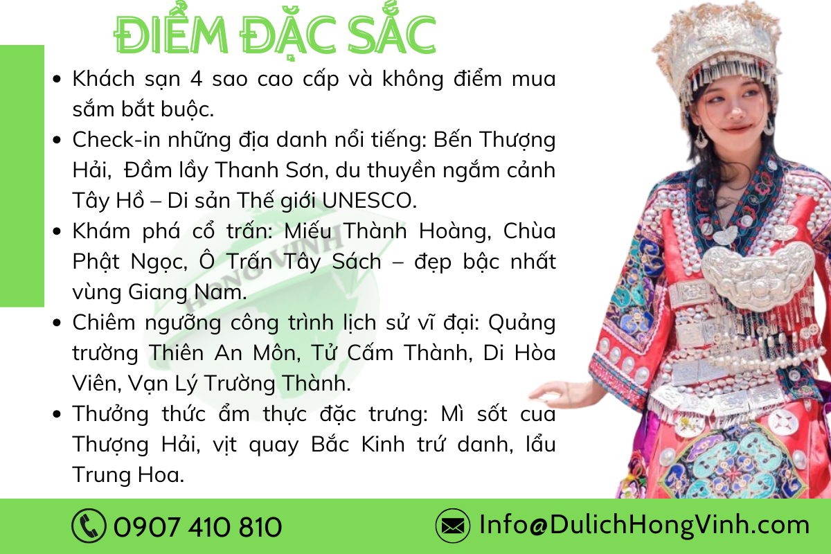 Hành trình Trung Hoa huyền thoại 7N6Đ – đưa bạn băng qua Thượng Hải hoa lệ, Ô Trấn cổ kính, Hàng Châu nên thơ và Bắc Kinh uy nghi tráng lệ. Chạm vào vẻ đẹp ngàn năm của Vạn Lý Trường Thành, Tử Cấm Thành rực rỡ, và thưởng thức tinh hoa ẩm thực với món Vịt quay Bắc Kinh trứ danh.