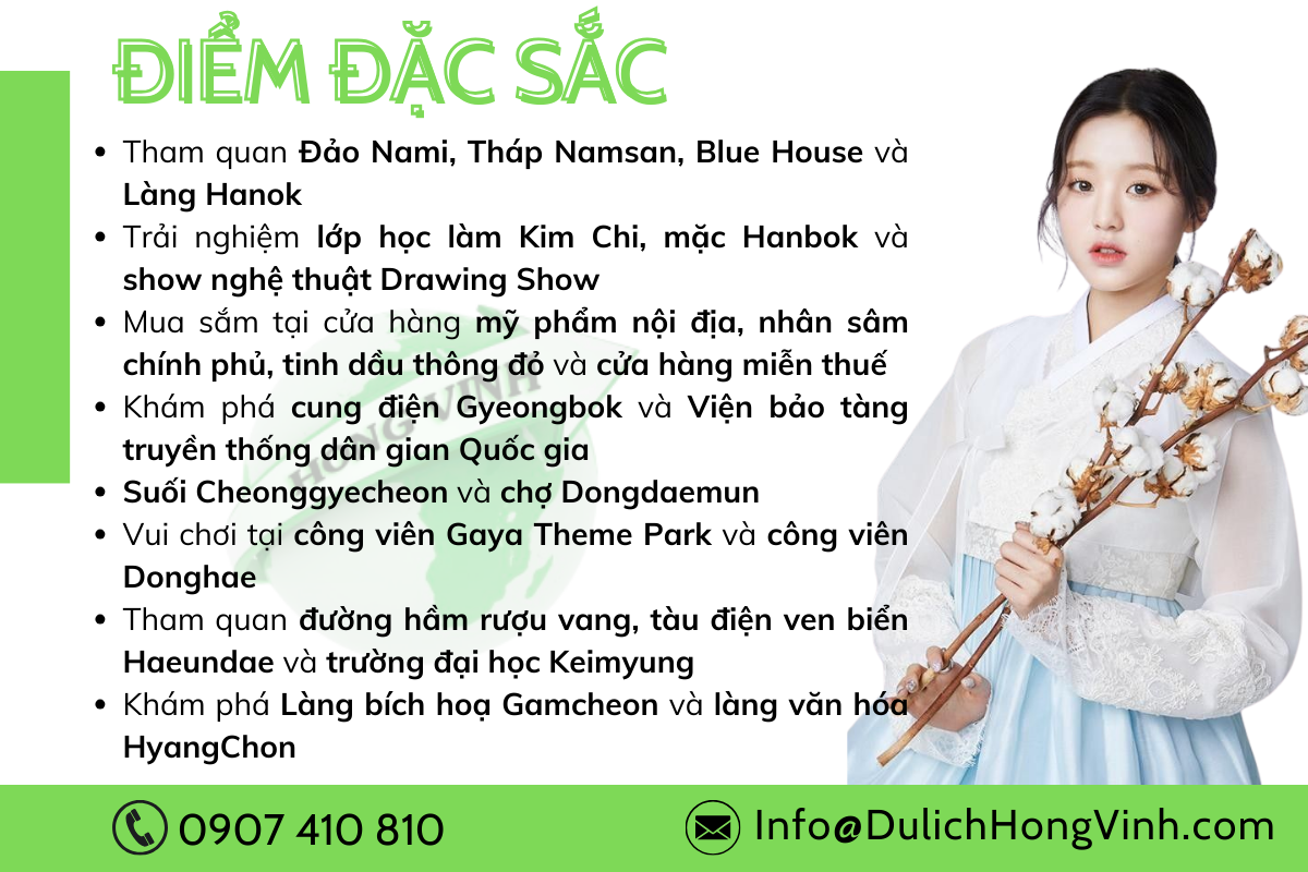 Tour Hàn Quốc khám phá Busan, Daegu, Seoul và Nami với những điểm đến nổi bật như Chùa Haedong Yonggungsa, Làng bích hoạ Gamcheon, Cung điện Gyeongbokgung và đảo Nami. Du khách sẽ trải nghiệm văn hóa, lịch sử, mua sắm và thưởng thức ẩm thực đặc sắc.