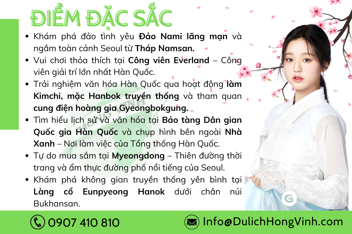 Hành trình khám phá Seoul sôi động với những điểm đến nổi tiếng như Đảo Nami lãng mạn, Tháp Namsan biểu tượng thủ đô và vui chơi thỏa thích tại Công viên Everland. Trải nghiệm văn hóa Hàn Quốc đặc sắc với Hanbok, Kimchi, tham quan Gyeongbokgung cổ kính và mua sắm thả ga tại Myeongdong – thiên đường thời trang và ẩm thực Seoul.